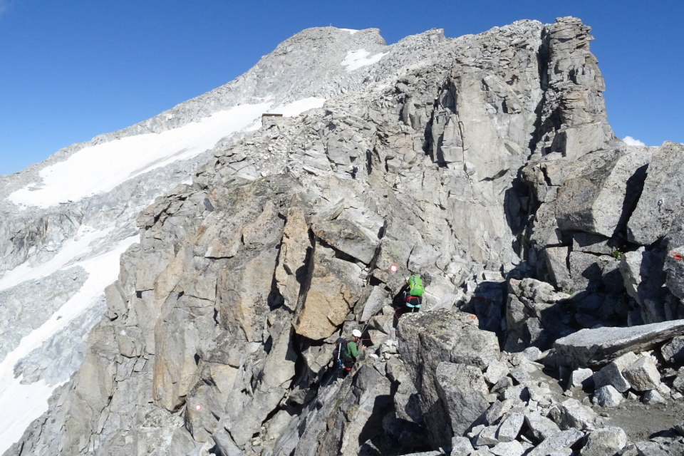 La via percorsa è stata quella detta "di Monte Nero". In sintesi la descrivo come segue. Partiamo poco dopo le 6 dal rifugio Segantini (m.2371) con sentiero sulla morena, poi pietraia, in seguito mettiamo piede sul piccolo ghiacciaio (vedretta) di Monte Nero che percorriamo salendo sulla sinistra fino all'inizio della via ferrata che aiuta nel superare la cresta che scende dal Monte Nero. Saliamo con l'aiuto di cavi e staffe su blocchi di tonalite sbucando alla bocchetta di Monte Nero (m.3078). Da qui sempre con ferrata scendiamo di circa 50 metri sull'altro versante in una valletta secondaria della Val di Nardis, attraversiamo una pietraia a grossi blocchi fino ai piedi di un salto di roccia che superiamo in arrampicata non difficile (qui mi farò assicurare con la corda al ritorno tramite degli ancoraggi messi in loco) e sbuchiamo su una spalla pietrosa. Poi ci caliamo in un intaglio (detto "i caminetti") che superiamo sempre con l'aiuto di attrezzature metalliche e arriviamo al Bivacco Brigata Orobica (m.3382). Gli altri escursionisti proseguono fino in cima alla Presanella, che raggiungono alle 11.30 lungo una cresta di massi accatastati.