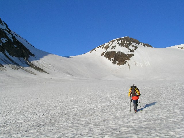 Attraversiamo il ghiacciaio puntando all'evidente pendio che scende dal colle